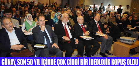"Bizim zihin dünyamızın bütünüyle ilgili bunun gibi çok daha fazla toplantıya ihtiyaç var" diye konuşan Günay, günümüz aydınlarını da eleştirdi. Aydınların ilerici misyon yüklenmek yerine, medeniyetler çatışmasının sözcüsü olduklarını söyleyen Günay, "Bizim aydınlarımız arasında yeterince diyalog kurulamadı. Son 50 yıl içinde çok ciddi bir ideolojik kopuş oldu. Bir çoğu bir kamplaşmanın sözcüsü haline geldi" şeklinde konuştu. Bakan Günay, kendilerine yönelik eleştiri getirenleri de "Demokrasiye yapılan müdahaleler karşısında sessiz kalmakla" eleştirdi.