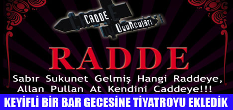 Anadolu yakasında bar tiyatrosunda bir ilkin temsilcileri olan,Cadde Oyuncuları RADDE adlı oyunlarında yaşamı ti'ye alan skeçleriyle yüzünüzde kalacak ilk tebessümün kahkahasını attırmak üzere 18 Mart Perşembe günü 21:30 da Kalamış POSH' un 1. Katında POSH BAR' da!!!