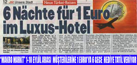Makro Markt sözcüsü Jana Przybylak, BZ gazetesine yaptığı açıklamada, bu fiyatın başlangıçta ''bir hediye'' olduğunu belirterek, ''Antalya yakınlarındaki 5 yıldızlı bir otelde yarım pansiyon 6 gece 1 euro'ya tatil sunuyoruz. Bundan istifade etmek isteyenler uçak biletlerini kendileri alacaklar. Bu cazip teklif 1-10 Eylül arasında rezarvasyon yaptıranlar için geçerli olacaktır'' dedi.