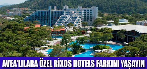 Avea'lılara özel kampanyalar ile Rixos Hotels farkını yaşayabilirsiniz. Rixos Hotels ve Avea işbirliği ile düzenlenen 2 farklı kampanyadan biri olan “Avea Platinum Kampanyası” kapsamında Avea aboneleri 1 Şubat – 15 Mart 2011 tarihleri arasında Rixos Hotels konaklamalarında yüzde 25, SPA hizmetlerinde ise yüzde 20 indirim kazanacaklar. Sevgililer Günü'ne özel uygulanan “Avea Sevgililer Günü” kampanyasında ise Avea aboneleri için Rixos Hotels'de konaklamalar yüzde 20, SPA hizmetleri ise yüzde 15 indirimli olacak.