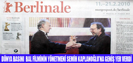 Gazetenin birinci sayfasında "Bal ile Ayı Avlanır" başlığıyla verilen haberde, Kaplanoğlu'nun "Bal" filmiyle Türkiye adına, 46 yıldan sonra ikinci kez "Altın Ayı" ödülünü kazandığı hatırlatıldı. Gazetede ayrıca Kaplanoğlu ile yapılan röportaj yayımlandı. "Yumurta" adlı filminde Yusuf karakterini 43, "Süt" filminde 18, "Bal" filminde de 6 yaşındaki haliyle gösterdiğini belirten Kaplanoğlu, böylece bu karakterin çekirdeğine ulaşmaya çalıştığını söyledi.