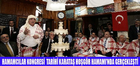 Hamamda düzenlenen kongrede önce oy kullanan üyeler ve İzmir Ticaret Odası (İZTO) Meclis Başkanı Necip Kalkan, daha sonra göbek taşına yattı.İzmir Hamamcılar ve Banyocular Odası'nın Tarihi Karataş Hoşgör Hamamı'nda gerçekleştirilen olağan kongresine İZTO Meclis Başkanı Necip Kalkan, İzmir Esnaf ve Sanatkarlar Odaları Birliği Başkanı Zekeriya Mutlu ile oda üyeleri ve çeşitli oda temsilcileri katıldı. Hamamcılar ve Banyocular Odası'nın Divan Kurulu Başkanı Hilmi Kurtoğlu'nun yıllık faaliyet raporunu okumasının ardından söz alan mevcut Oda Başkanı Nafi Karaca, kongrenin hamamda gerçekleşmesinin gerekçelerini giydiği peştemalle anlattı.