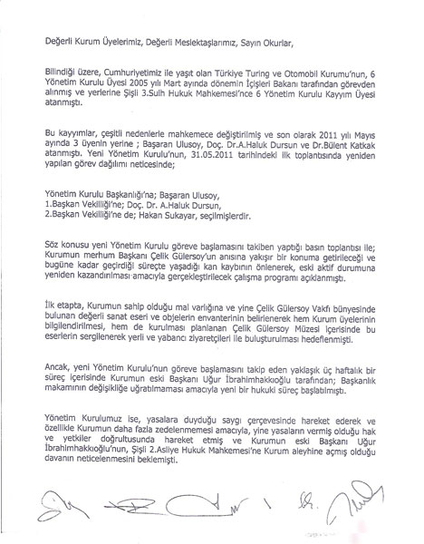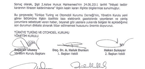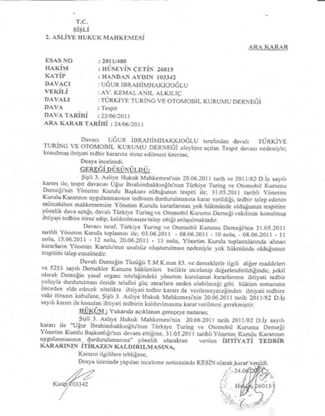 Uğur İbrahimhakkıoğlu'nun kayyım yönetimine koydurduğu ihtiyati tedbir kararı Şişli 2. Asliye Hukuk Mahkemesi tarafından kaldırıldı. Böylece Başaran Ulusoy başkanlığındaki kayyım yönetimi yeniden Turing'in başına geçti. Turing'in eski başkanlarından Uğur İbrahimhakkıoğlu'nun Başaran Ulusoy başkanlığındaki kayyım yönetimi için aldırdığı ihtiyati tedbir talebi kararı Şişli 2. Asliye Hukuk Mahkemesi tarafından kaldırıldı. Böylece Başaran Ulusoy başkanlığındaki kayyım yönetimi görevine geri döndü. Türkiye Turing ve Otomobil Kurumu'ndan açıklama yapıldı.Sonuç olarak Şişli 2. Asliye Hukuk Mahkemesi'nin 24.06.2011 tarihli "İhtiyati tedbir kararının itirazen kaldırılmasına" ilişkin kesin kararı verilmiştir."