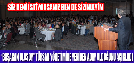 Aralık'ta yapılacak seçimler için "Bu camia ne derse onu yapacağım" diye konuştu. Başkanınız olarak beni istiyorsanız bende sizinleyim dedi.Lütfi Kırdar Kongre Merkezi'nde düzenlenen TÜRSAB Asya-Avrupa ve Boğaziçi Bölgelerini kapsayan İstanbul Toplantısı'nda konuşan TÜRSAB Başkanı Başaran Başaran Ulusoy Birlik üyelerine seslendi.