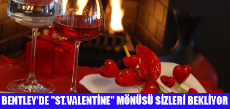 Bentley'e gelen sevgililer, otelin İtalyan çizgileri taşıyan özellikli dekorunda Hoşgeldiniz Kokteyl'i ile sımsıcak bir biçimde karşılanıyor... Sonrasında Bentley Restaurant'ın romantik ambiansında buluyorlar kendilerini... Havada aşk kokusu, fonda aşk melodileri... “St. Valentine Mönüsü” de davetkar haliyle... Sevgiyle hazırlanan özel mönüde; başlangıç olarak Ilık Dana Carpaccio; parmesan peyniri ve rokalı balsemico sos ile sunuluyor çiftlere... Ardından Çıtır Kase İçinde Üç Renkli Ravioli; istiridye mantarı sosu ile... Biraz ferahlık, bir küçük mola için ise Sorbet, naneli nar şurubu ile... Ana yemek olarak ise Bonfile Gratine; rezene sotesi ve kırmızı biber sos ile. Finalde ilginç bir tatlı; Kestaneli Pembe Parfe, meyve sos ile. Ve tabii sonunda çay ya da kahve...