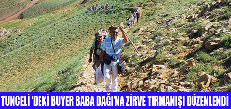 Tunceli Dağcılık İl Temsilciliği tarafından 3 bin metre rakımı bulunan Buyer Baba Dağı'na düzenlenen tırmanışa, yaşları 11 ila 60 arası değişen 126 doğasever katıldı. Moğultay Mahallesi Yeraltı Çarşısı üzerinde biraraya gelen doğaseverler, tırmanışın yapılacağı Pülümür ilçesine bağlı Kocatepe köyüne gitti. Buradan 13 kilometrelik yer yer karla kaplı parkurda tırmanışa başlayan doğaseverler, 2 saat 30 dakikalık yürüyüşün ardından zirve yaptı.