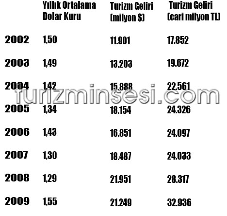 İlk tablomuzda, turizm gelirlerimiz T.C.Merkez Bankası'nın yıllık ortalama dolar kuru kullanılarak TL'ye çevrilmiştir. Görüldüğü üzere, 2002'de 1,50, 2003'te 1,49 olan ortalama dolar kuru, sonraki yıllarda düşmüş, 2008 yılında ise en düşük seviyesi olan 1,29'a inmiştir. 2009 yılında biraz hareketlenen dolar kuru ortalama 1,55'e yükselmiştir. Tablodan da görüldüğü üzere, TL bazında 2002 yılında 17 milyar 852 milyon TL olan turizm gelirimiz, 2009 yılında 32 milyar 936 milyon TL'ye yükselmiştir. Bu artış cari gelirlerdeki artış olup, nominaldir ve enflasyondan arındırılmamıştır.
