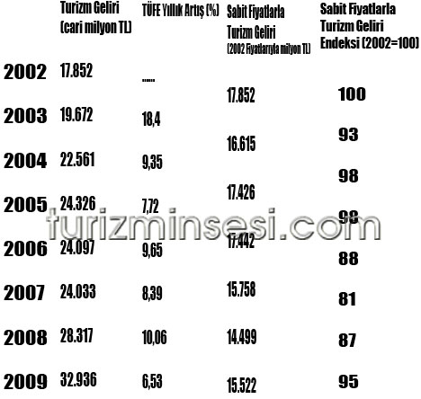 Tablodan da görüldüğü üzere, enflasyon etkisiyle 2002-2009 yılları arasında turizm sektörünün TL bazında reel geliri % 5 azalmıştır. Oysa turist sayısı 2002'de 13,3 milyon iken 2009'da 27,1 milyona yükselmiş, yani % 104 artmıştır. Ziyaretçi sayısındaki artışa karşılık, reel satış hasılatı küçük bir miktar azalmıştır.
