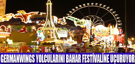 Germanwings yeni uçuş programı çerçevesinde İstanbul, Antalya, Ankara ve İzmir merkezli Köln/Bonn, Stuttgart, Berlin, Hannover, Hamburg ve Dortmund dahil olmak üzere toplam altı noktaya sefer düzenleyecek. Nisan ayında uçuşlarına başlayacak olan Germanwings yolcularını uygun fiyatlarla buluşturmaya devam ediyor. 23 Nisan'da başlayacak olan Stuttgart Bahar Festivali'ne Germanwings' in 19€' dan başlayan fiyatları ile katılma imkanına sahip olabilirsiniz. Yıl boyunca çok sayıda kültür aktivitesinin düzenlendiği Almanya'nın Stuttgart kentinde düzenlenecek olan Stuttgart Bahar Festivali 23 Nisan'da başlayıp Mayıs ayının ortasına kadar devam edecek.