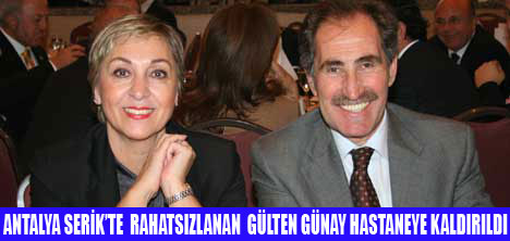 Bakan Ertuğrul Günay'ın eşi Gülten Günay, bir hafta önce tatil için geldiği Serik'te konakladığı otelde rahatsızlandı. İlçe merkezindeki Özel Aspendos Hastanesine kaldırılan Gülten Günay'ın bağırsak enfeksiyonu geçirdiği belirlendi.