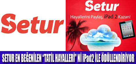 Setur'un Facebook sayfasında (www.facebook.com/Setur) paylaşılan “Hayalindeki Tatili Paylaş” konulu yazılar iPad2 kazanma şansı sunuyor. Facebook'ta Setur sayfasını beğenen kişilerin katılabileceği yarışmada katılımcıların tek yapması gereken; hayallerindeki tatili 135 yazı karakterine sığdırabilmek! 14 Ekim 2011 tarihine kadar en çok beğenilen 3 yazı, iPad2 kazanan isimleri belirliyor.