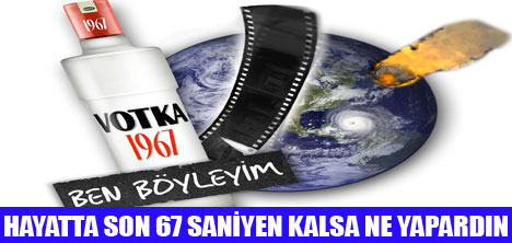Türkiye'nin votkası Votka 1967, “Ben Böyleyim” kampanyası kapsamında 2012 yılında dünyanın sonunun geleceğini rivayet eden Mayaların Marduk Efsanesinin yarattığı etkilerden ilham alarak, yepyeni ve çılgın bir kısa film yarışması düzenliyor: “67 Saniye”. “Hayatta son 67 saniyen kalsa ne yapardın?”ı sorgulayan kısa film yarışmasına başvurmak için, 18 yaşından büyük olmanız ve www.67saniye.com sitesine girmeniz yeterli. Mayıs ayı boyunca gerçekleşecek yarışmanın jüri üyelerinin arasında sunucu Oylum Talu, yönetmen Ozan Açıktan, mizahçı Aziz Kedi, radyo programcısı Ayça Şen gibi birbirinden renkli isimler bulunuyor. Siz de “Dünyanın Sonu Da Gelse Ben Böyleyim!” diyorsanız ve birbirinden güzel hediyelerin sahibi olmak istiyorsanız, hayattaki son 67 saniyenizi anlatan videoyu 67saniye.com'a hemen yükleyin.