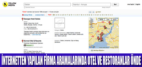 600 farklı kategori altında sınıflandırılmış 800 bine yakın tekil firma bilgisi ile Türkiye’nin en büyük ve en güncel firma rehberi olan Yellow.com.tr’nin verilerine göre, kullanıcılar internette en çok otel, restoran ve mobilya-dekorasyon ürünleri satan firmaları arıyor.Tüm detaylı iletişim bilgileri dahil, firmalarla ilgili pek çok bilgiye ulaşmayı sağlayan Yellow.com.tr’nin en popüler 10 kategorisini gösteren verilere göre, kullanıcılar tarafından en çok aranan kategoriler listesinin ilk sırasını oteller aldı. Restoranlar ve mobilya-ev kategorisinin ikinciliği ve üçüncülüğü paylaştığı listede bankalar, akaryakıt istasyonları ve seyahat acenteleri de en çok aranan firmalar arasında yer aldı. Tekstil üreticileri, çiçekçiler, giyim ve ayakkabı ile avukatlar da internet kullanıcılarının en çok ziyaret ettiği diğer kategoriler olarak sıralandı.