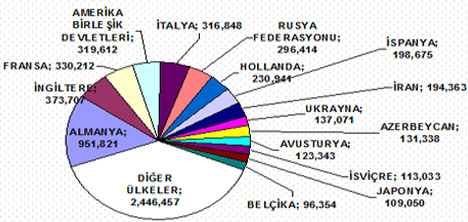 Almanlar:%14.9, İngilizler:%5.9, Fransızlar:%5.2, Amerikalılar:%5.0, İtalyanlar:%5.0, Ruslar:%4.7, Hollandalılar:%3.6, İspanyollar:%3.1, İranlılar:%3.1, Ukraynalılar:%2.2, Azerbaycanlılar:%2.1, Avusturyalılar:%1.9, İsviçreliler:%1.8, Japonlar:%1.7, Belçikalılar:%1.5, Diğer ülkeler: 38.4