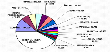 2011 yılının ilk yedi ayında İstanbul'a gelen yabancıların toplamdaki yüzdeleri şöyle oluştu: Almanlar:%12.1 , Ruslar:%6.2 ,Amerikalılar:%5.4 , Fransızlar:%5.3 ,İngilizler:%4.8 ,İtalyanlar:%4.6 ,İranlılar:%4.2 , Hollandalılar:%3.1 ,İspanyollar:%2.2 ,Japonlar:%2.0 , Ukraynalılar:%1.9 ,Azerbeycanlılar:%1.9 ,Iraklılar: %1.8 ,Avusturyalılar:%1.8 ,Güney Koreliler:%1.7 ,Diğer ülkeler: 40.9