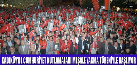 25 Ekim Pazartesi günü geleneksel meşale yakma töreniyle başlayacak kutlamaların kalbi ise 29 Ekim'de Bağdat Caddesi'nde düzenlenecek Cumhuriyet'e Bağlılık Yürüyüşü'nde atacak. Cumhuriyetimizin kuruluşunun 87. Kuruluş Yıldönümü kutlamaları Kadıköy de her yıl geleneksel olarak yakılan Meşale Yakma Töreniyle başlayacak. 25 Ekim Pazartesi günü Kadıköy İskele Meydanı Atatürk Anıtı 'nda yapılacak törende Cumhuriyetin Aydınlık ışığını temsil eden meşaleyi Kadıköy Belediye Başkanı Selami Öztürk, öğrencilerle birlikte sembolik olarak yakacak. Meşale bir hafta süreyle yanacak.