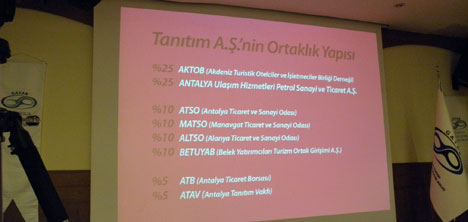 Yaklaşık 2 saat süren Antalya Tanıtım.A.Ş'nin ne olduğu konusu ise yaklaşık yarım saat görüşülürken, başkanların sözleri güne damgasını vurdu. Antalya'nın tanıtımı amacıyla kamu-özel sektör işbirliği ile kurulan Antalya AŞ'nin Genel Müdürü Yusuf Örnek, yaptığı sunumda , şirketin hedeflerini, Antalya turizmine kazandıracakları ve nasıl gelir elde edeceği konularında bilgiler verdi.Örnek , Kemer bölgesinin özellikle doğa ve tarihi bakımdan çok zengin bir bölge olduğuna dikkat çekerken, dünya miras listesinde yer alan eserlerin bir çoğunun Antalya'da olduğunu ve bu 16 eserin de Kemer sınırları içerisinde yer aldığını belirterek , Kemer'in bu şansını en iyi şekilde kullanması gerektiğini söyledi. Kurulan şirketin Antalya'yı tüm dünyada bilinen bir kent haline getirebileceğini kaydeden Örnek, "Antalya neden Avrupa Kültür Başkenti olmasın?" dedi. ATSO Başkanı Çetin Osman Budak ve AKTOB Başkanı Surui Çorabatı'da Antalya Tanıtım A.Ş'nin çok önemli işlere imzasını atacağını ve Kemer'in de bu yapının içinde olmasından duydukları memnuniyeti dile getirdiler.