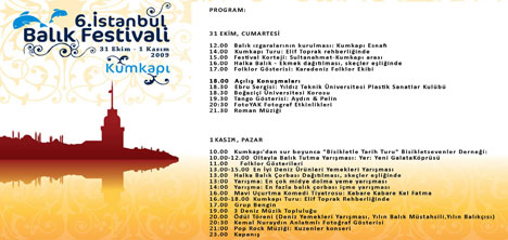 Şehristanbul Derneği, Fatih Belediyesi ve Kumkapı Turistik Restaurantları ve Esnafları Derneği işbirliği ile 10 11 Ekim 2009 tarihleri arasında düzenlenecek 6.İstanbul Balık Festivali bu yıl Tarihi Kumkapı Meydanı'nda yapılacaktır.