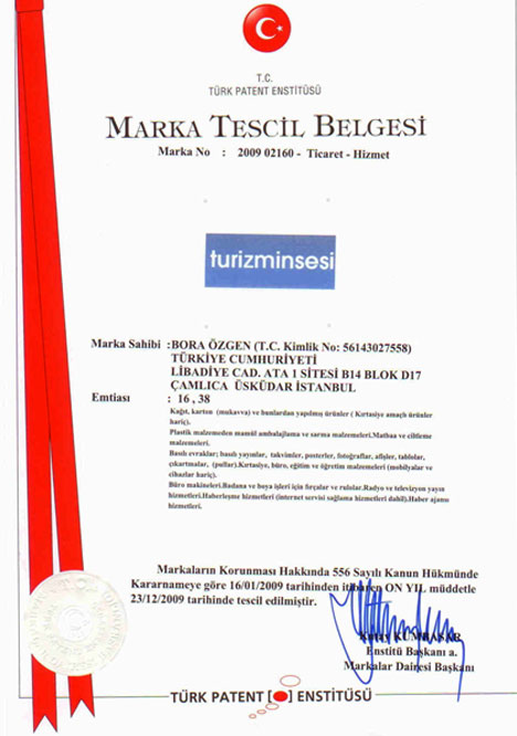 13.07.2009 tarih ve 167 no.lu Resmi Marka Bülteni'nde yayınlanan TURİZMİN SESİ Marka Tescil Başvurumuz,