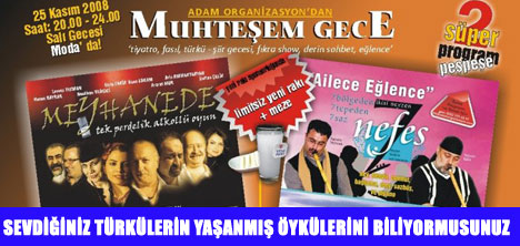 25 Kasım Salı akşamı Moda Spor Kulübünde gerçekleştirilecek oyun adam organizasyon tarafından düzenleniyor. Bu oyun nasıl bir oyun? Adam Organizasyon yetkilisi Hakan Karaman yaptığı açıklamada, Bilenler bilir. Şimdiye kadar yapılmamış bir oyun. Yeni rakı sponsorluğunda gerçekleştiriyoruz oyunumuzu. Bildiğiniz koltuklu oturma düzeninin dışında masalardasınız. Limitsiz rakı yada şarabınızı içip , mezelerinizi atıştırırken, aranızdan geçen meyhanecinin sesi ile başlıyor.