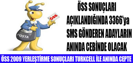 Turkcell, “OYS” yazıp bir boşluk bırakarak TC kimlik numarasını yazıp 3366'ya SMS atan üniversite öğrencisi adaylarına, ÖSS 2009 yerleştirme sonuçlarını, açıklandığı gün anında gönderecek.