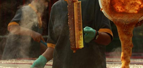 "Üretim yaş haldeki dutla yapılacaksa kaynatma aşaması öncesi su ile yıkanan dutlar, kazanlarda 2-4 saat arasında kaynatılıyor. Bir gecelik soğutma aşaması sonrasında özel torbalara alınan pişmiş dutun suyu çıkarı lıyor. Pişme suyu ile birlikte diğer hammaddeler olan bal ve süte yan ürün olarak un katılıyor. Belli bir akışkanlığa ulaşan ve 'herle' adı verilen sıvı, yüksek sıcaklıkta ikinci kez ışıl işleme tabi tutuluyor. Tadını ve akışkanlığını kazanan 'herle'ye, ufak parçalara ayrıştırılmış fındık veya ceviz ekleniyor. Kaplarla taşınan pestil sıvısı, özel kumaşlar üzerine serilerek ince bir tabaka haline gelmesi sağlanıyor.