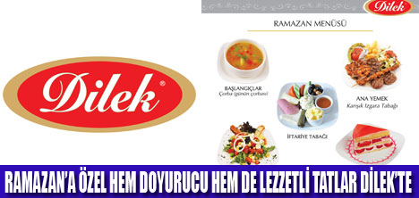 Pastane sektöründe elde ettiği haklı ününü aynı hizmet ve kalite anlayışı ile geleneksel lezzetleri modern bir sunumla yemeğe de taşımayı başaran Dilek, hazırladığı “Ramazan Menüsü” ile hem göze hem de damak tadınıza hitap ediyor. Dilek, en ünlü yerel mutfaklardan çıkan lezzetleri, ustalığıyla harmanlayarak beğeninize sunuyor. On bir ayın sultanı Ramazan'a özel uygun ve doyurucu menüsü ile evinizdeki samimiyet ile mutfağınızdaki lezzeti birarada bulacaksınız.