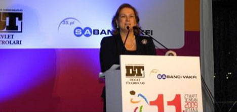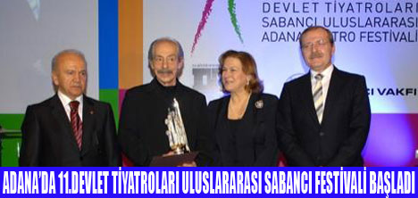Rahmetli Sakıp Sabancı ön sıradan beni izleyerek, kendine özgü coşkusuyla boynuma sarılıp beni kutlamıştı. Bugün yıllar sonra onun adının konduğu bu değerli ödülü almakla, arkada bıraktığım 50 yılı taçlandırmak adına çok onur duydum." Bu arada, törene katılacağı açıklanan Kültür ve Turizm Bakanı Ertuğrul Günay'ın, seçim çalışmaları nedeniyle katılamadığı öğrenildi. Festival, 6 devlet tiyatrosu, 4 özel tiyatro, 6 yabancı grup ve 1 şehir tiyatrosu ekibinin toplam 18 oyunla 30 Nisan'a kadar sanatseverlerin karşısında olacak.