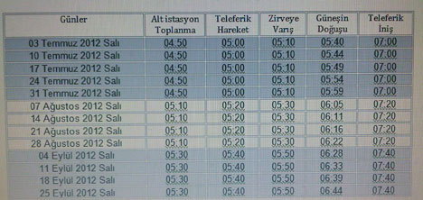 Gün doğumunu zirvede izlemek isteyen yerli ve yabancı turistler için oluşturulan ''Zirvede Sunrise'' 03 Temmuz 2012 itibariyle başlayacak. Geçtiğimiz yıllarda oldukça büyük ilgi gören ''Zirvede Sunrise'' etkinliği için Olympos Teleferik özel seferler yapacak. Misafirler güneşin doğuşunu bu özel atmosferde izlerken, bu yıl 2365.mt de zirvede hizmete açılan Shakespeare Coffee&Bistro Mountain da hazırlanan sınırsız çay, kahve, kurabiye ve kek ikramları da misafirlere sunulacak.