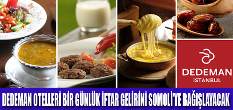 Türkiye'nin en yaygın oteller zinciri olan Dedeman Hotels & Resorts International, bir sosyal sorumluluk adımı daha atıyor.Yaşam mücadelesi veren Somali halkına tüm Türkiye gibi Dedeman Hotels & Resorts International da yardım elini uzatıyor.Dedeman Otelleri, tüm otellerinin bir günlük iftar yemeklerinden elde ettiği geliri Somali'ye bağışlayacak. 25 Ağustos 2011 Perşembe günü Dedeman otellerinde elde edilecek iftar gelirlerinin tümü Somali'ye yardım olarak bağışlanacak.