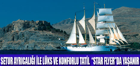 Setur ayrıcalığı ile sahip olabileceğiniz bu özel tatilde, birbirinden güzel koylarda, doğa ile iç içe, keyfin, huzurun ve rahatlığın tadını “Star Flyer” ile çıkarın.Geçmişin gelenekleriyle, günümüz konfor ve ayrıcalıklarının birlikteliği, bu eşsiz yelkenliye adımınızı attığınız ilk andan itibaren deniz seyahatinde yeni bir çağı keşfetmenizi sağlayacak. Pırıl pırıl pirinç kaplamaların her köşesinde onurlu mirasını yansıtan Star Flyer, denizlerde adeta zarif bir kuğu gibi süzülüyor.