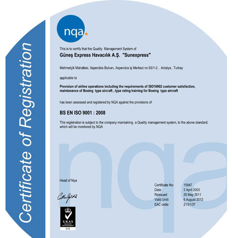 Bir havayolu işletmesi olarak bu standardı yakalayabilmek için şirket genelinde bir müşteri memnuniyet politikası geliştirdik. Kalite Yönetiminden Yer ve Uçuş İşletmeye, Kabin Yönetiminden Dispatch ve Eğitime, Satış ve Pazarlamadan Müşteri İlişkilerine pek çok departmanımızın iş süreçlerinde müşteri odaklı iyileştirmeler yaptık. Bir sonraki hedefimiz; en baştan itibaren şikayete yol açmayacak hizmetleri sunmak. şeklinde konuştu. Türk Hava Yolları ve Lufthansa'nın ortak kuruluşu olan SunExpress; Boeing, Nasa, gibi kuruluşları denetleyen NQA'den alınan ISO 9001 Kalite Yönetimi, OHSAS 18001 İş Sağlığı ve Güvenliği, ISO 14001 Çevre Yönetimi sertifikalarının yanı sıra IATA'nın operasyonel güvenlik belgesi IOSA'ya da sahip.