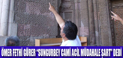 Araştırmacı Yazar Ömer Fethi Gürer Sungurbey Cami için bir kez daha çağrıda bulundu ve cami geçen yıla göre dahi önemli ölçüde işlemeleri dökülmüş durumdadır. Aslına uygun derhal müdahale edilmesi gereklidir. Vaıflar Genel Müdürlüğü tarihin yok oluşuna seyirci kalmaktadır” dedi.Niğde ili ilgili beş kitap yazan ve Niğde Kapadokya’nın Başkenti kitabında Sungurbey Camiiniher yönü ile anlatan Yazar Ömer Fethi Gürer İlhanlılar döneminde yapılmış olan Cami doğu portalında bitki, geometrik şekiller ve hayvan figürlerinden oluşan iki yüzde de önemli tahribat olduğuna dikkat çekerek şöyle dedi.- Bir tarih hazinesi hergün yok olmaktadır. Vakfılar Genel Müdürüne geçen yıl mektup yazdım. 18 yy kadar kubbeli ve çifte minareli olan cami o yıllarda Halil Betav yazdığına göre barut deposu olarak kullanılıyor.