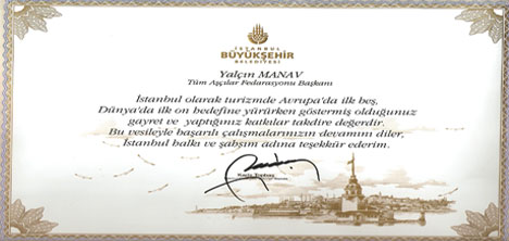 İstanbul'un, turizmde Avrupa'da ilk beş, dünyada ise ilk onu hedeflediklerini ve bu konuda bir çok çalışma yürüttüklerini belirten Topbaş, bu konuda desteklerinden dolayı kurum ve kişilere, özverili çalışmalarından dolayı teşekkür ederken, TAF başkanı Yalçın Manav'ın İstanbul'a kattığı değerden dolayı teşekkürlerini iletti.
