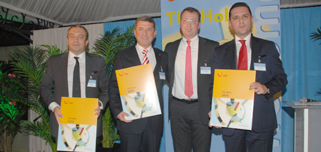Robinson Club Pamfilya Oteli Genel Müdürü Sichert ve Delphin Deluxe Resort Oteli Genel Müdürü Dr. Alper Cömertoğlu ile Cornella De Luxe Resort Genel Müdürü Hakan Duran da TUI Holly Büyük ödülünü aldılar.