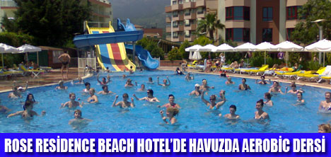 Turizmin gözde merkezlerinden Kemer'de bulunan Rose Residence Beach Hotel'de kalan turistler sabah ve öğleden sonra Animasyon ekipleri tarafından verilen Havuzda Aeorobic derslerine katılıyor. Havuza giren turistler, otel animasyon ekibi eşliğinde çalan müzik eşliğinde su jimnastiği yapıyorlar.