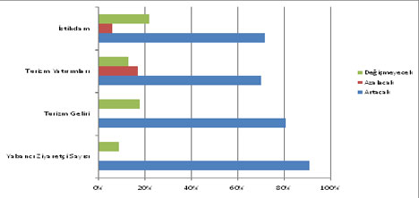 Ankete katılanların yüzde 81'i turizm gelirinin 2011'de 2010'a göre artacağını, yüzde 19'u değişmeyeceğini bekliyor. Artış beklentisine sahip olanların çoğu bu artışın yüzde 5'in altında kalacağını öngörüyor. Turizm yatırımları konusunda artış beklentisine sahip olanların oranı yüzde 70 olarak belirleniyor. Yüzde 17 yatırımların azalacağını, yüzde 13 ise değişmeyeceğini tahmin ediyor. Artış beklentisi içinde olanların çoğunluğu bu artışın yüzde 10'dan az olacağını öngörüyor.