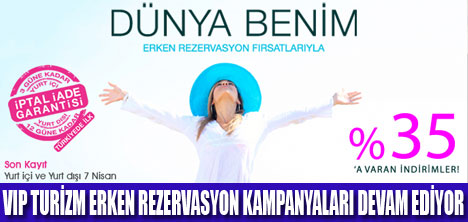 VIP Turizm'in “Dünya Benim” adını verdiği kampanyada tüm seyyahlara yüzde 35'e varan indirimler sunuyor.Yurtdışında 7 kıtada, yurtiçinde 7 bölgede sunulan erken rezervasyon fırsatlarıyla, dünyanın en güzel ve en özel yerleri ile en şahane tesisleri artık ulaşılmaz değil. VIP Turizm'in, 2011 turlarına, 7 Nisan tarihine kadar erken rezervasyon yaptıran herkes az ödeyip, çok gezecek. Yılın ikinci erken rezervasyon kampanyasıyla yurt içinde yüzde 35'a, yurt dışında yüzde 30'a varan cazip indirimler sizleri bekliyor. Üstelik yurt içi turlarda 3, yurtdışı turlarda 12 güne kadar iptal iade garantisi ve 12 aya varan taksit imkanları ile!